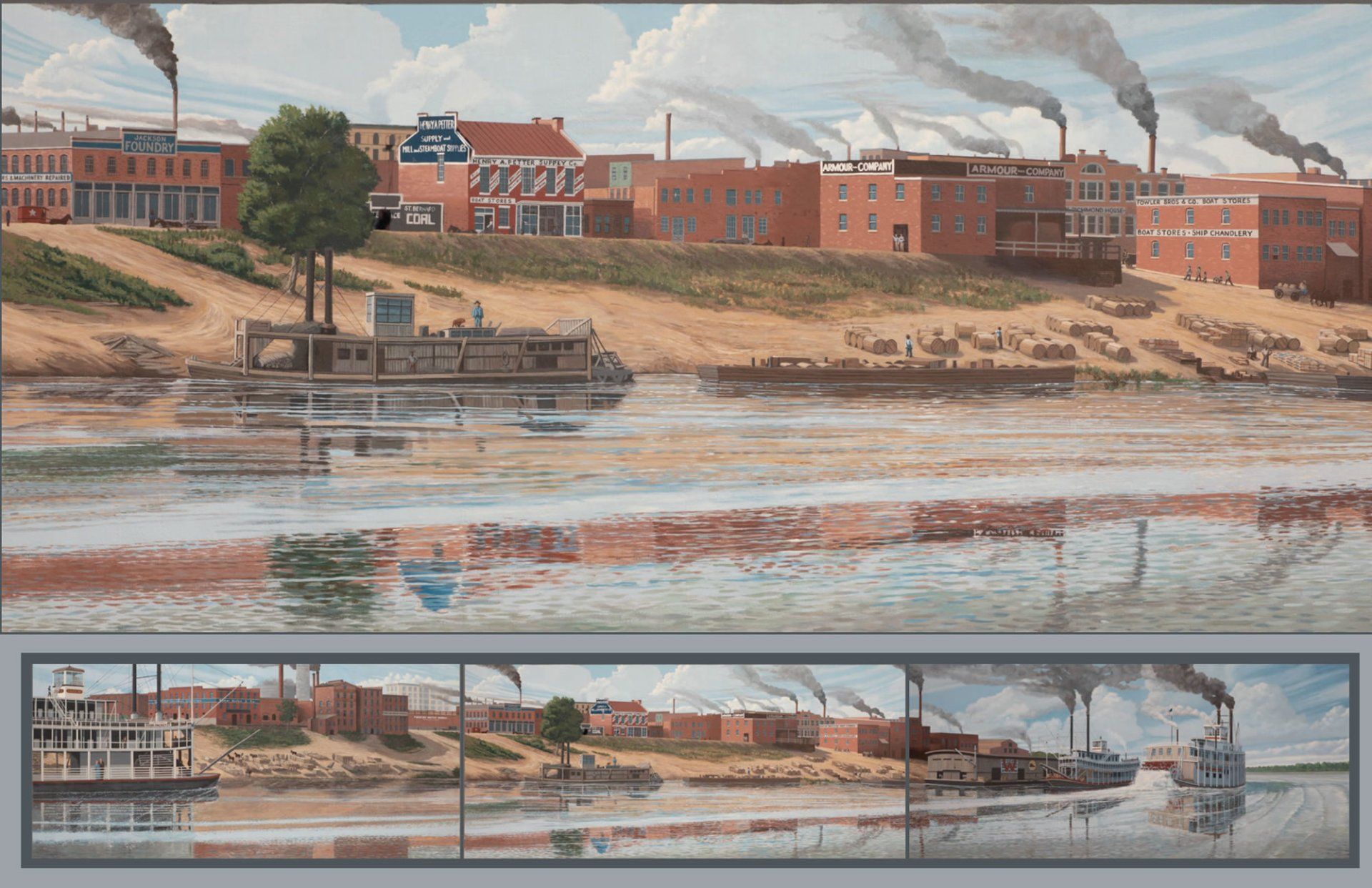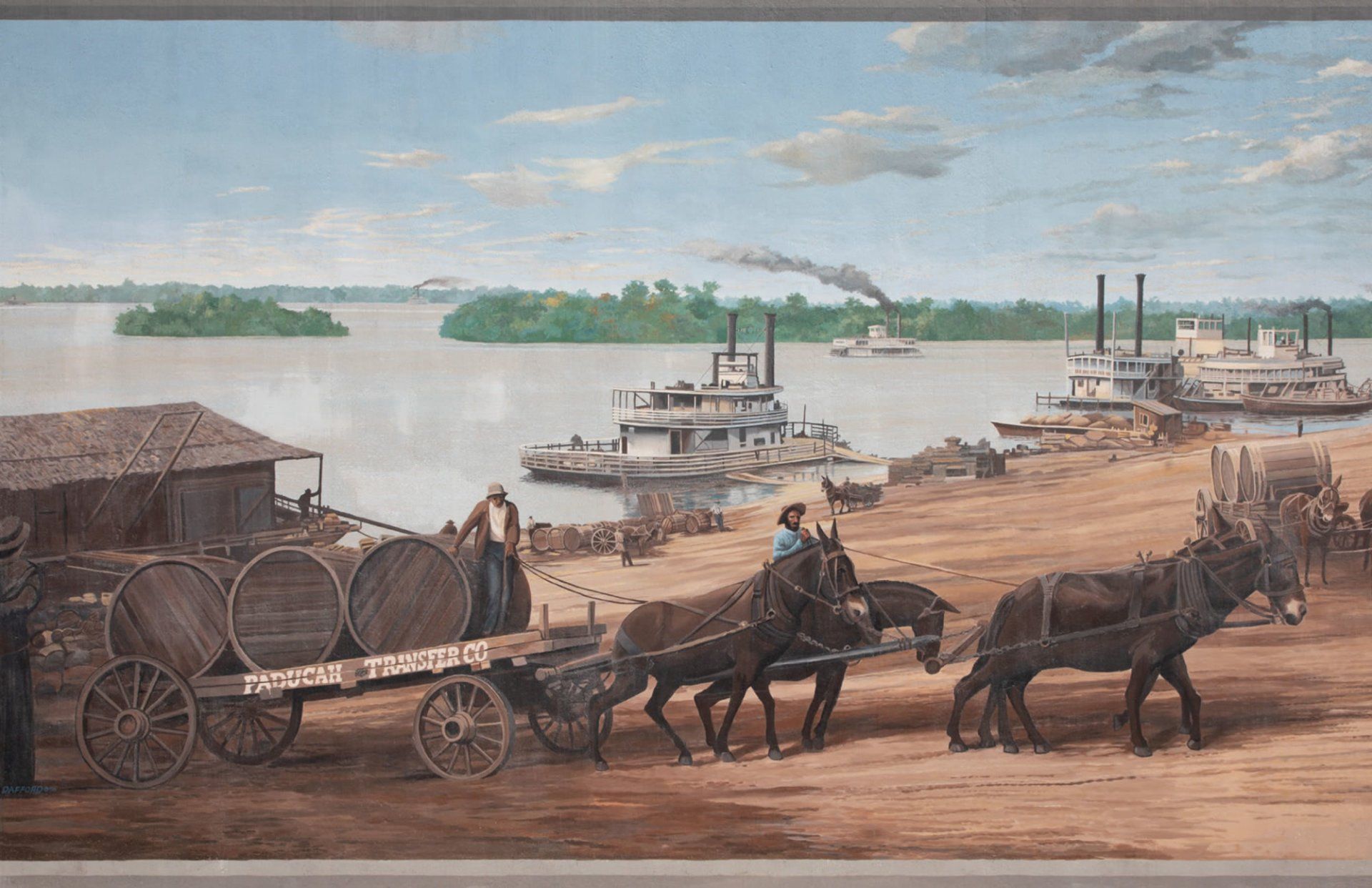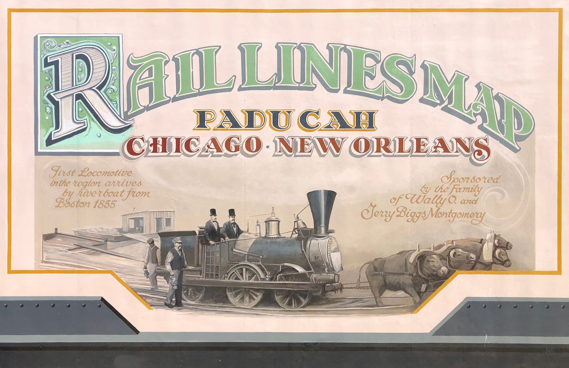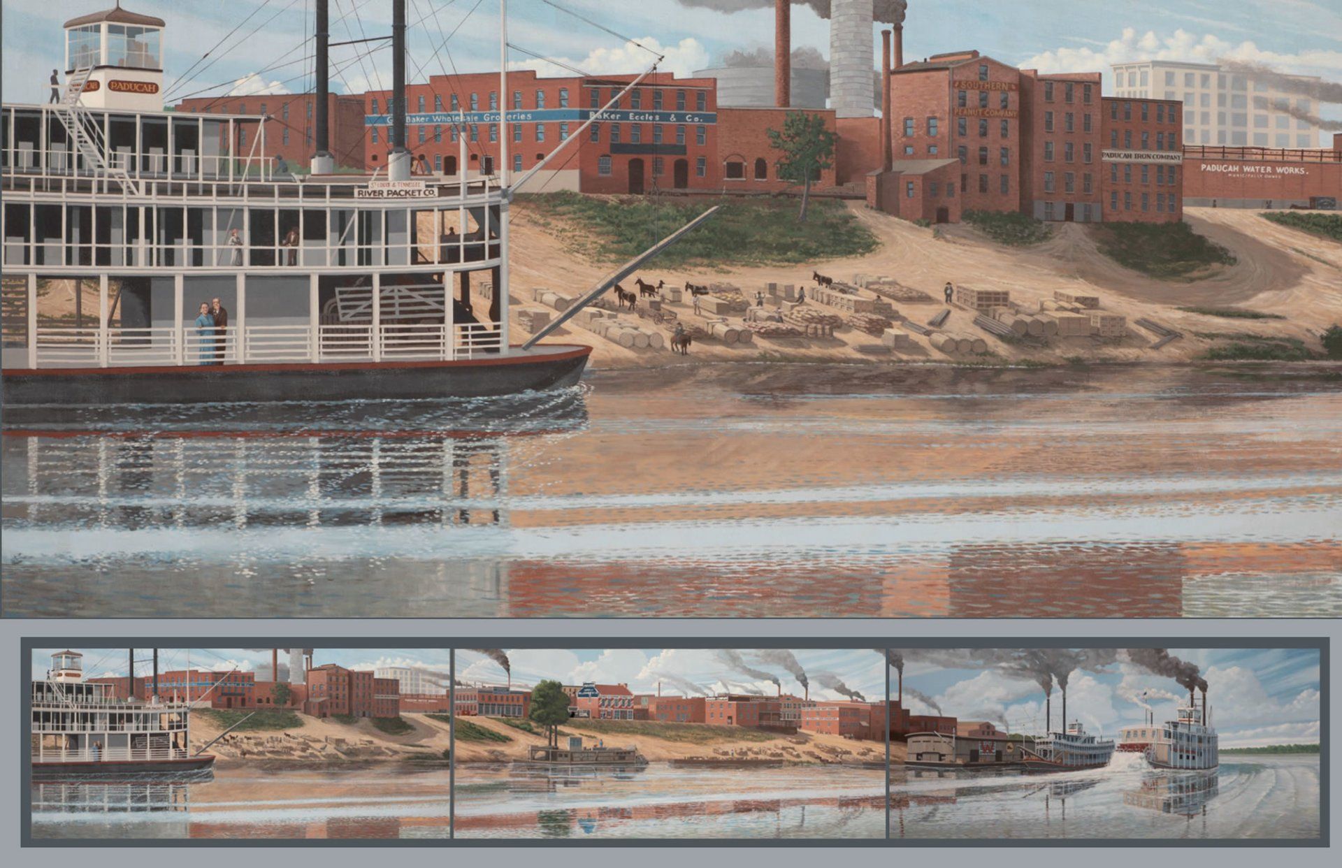 The renowned Dafford Muralists capture Paducah's rich history in paintings on this UNESCO Creative City's floodwall overlooking the confluence of the Ohio and Tennessee Rivers. This visionary project began in the spring of 1996. The first twenty-panel timeline was completed in 2001 and the last ten rail history panels in the three block section were unveiled in 2022.
